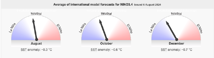The El Niño–Southern Oscillation (ENSO) and the Indian Ocean Dipole (IOD) are currently in a “neutral” phase, meaning they’re not strongly affecting the weather right now. However, there’s a chance that La Niña, which can bring cooler and wetter conditions, might develop later this year. Meanwhile, the Southern Annular Mode (SAM) is negative, which might lead to more rain in southern Australia. Overall, these climate patterns help predict weather trends, but right now, nothing extreme is happening.